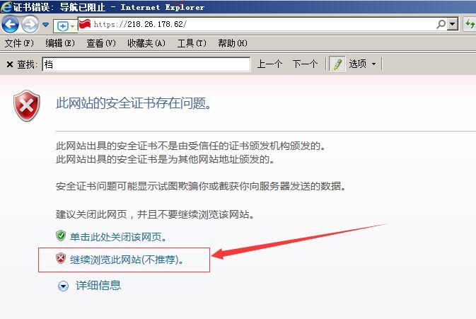 在可以上互联网的机器上打开IE浏览器(IE8以上),输入https://218.26.178.62,此时会看到如下页面 (此步只需要在第一次使用时执行)