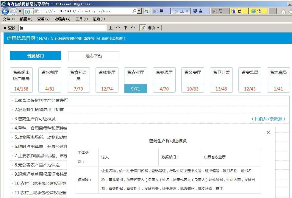 4、省信用信息管理中心依据最终确定的目录在山西省信用信息共享平台中进行相应配置,实现数据报送。配置结果可在山西省信用信息共享平台http://59.195.240.7 (要求通过电子政务外网访问)查看,如下图: