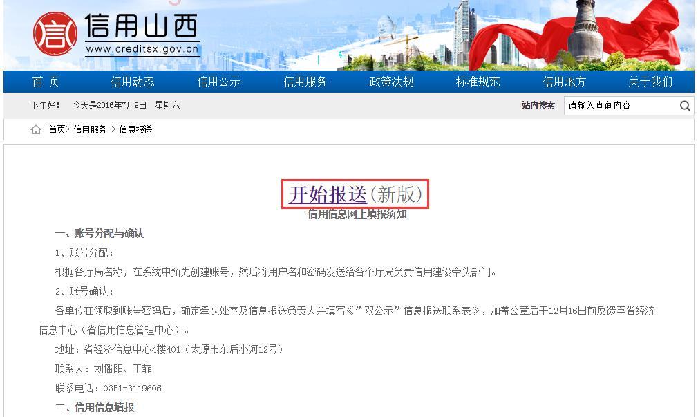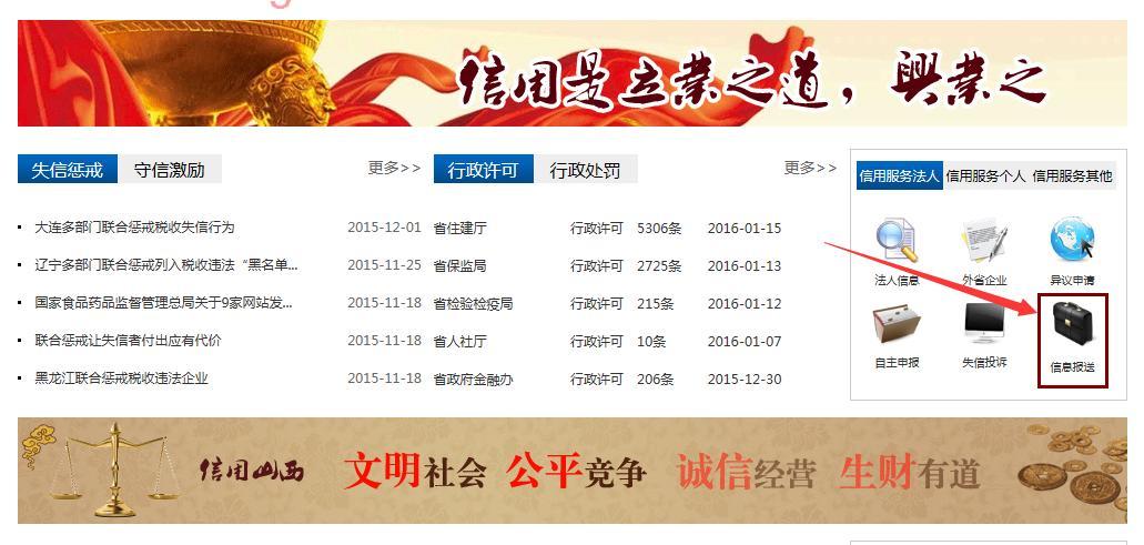 步骤2:上报单位在“77365体育在线”网站www.fyjk158.com“信用服务”栏目下,点击“信息报送”。也可直接输入http://59.195.240.7/CreditGovDepSystem
