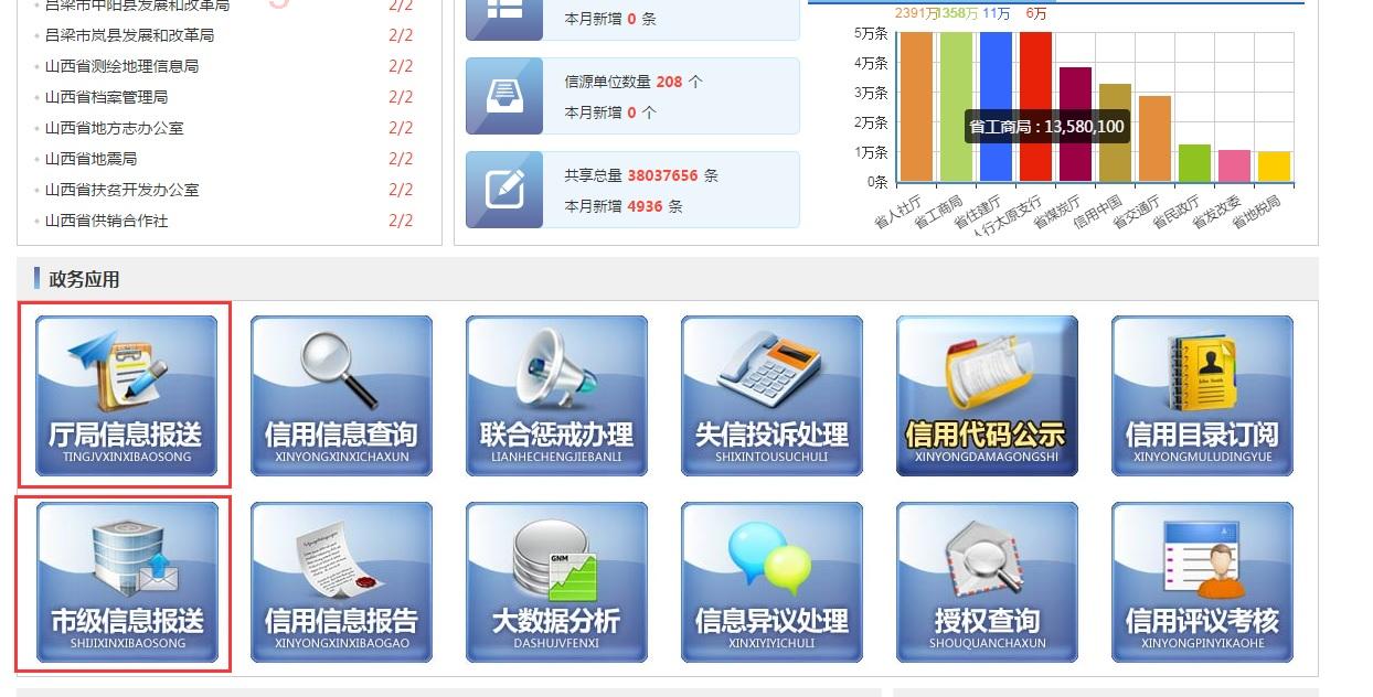 步骤3:在“山西省信用信息共享平台”上点击“厅局信息报送”或者“市级信息报送”进入“政府应用系统”: